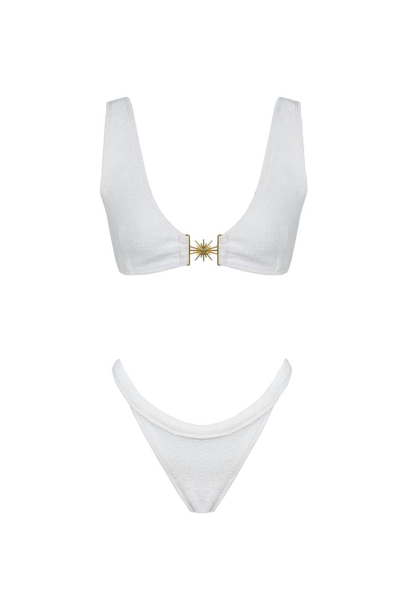 CORALIE 2P Bikini in Hunza White is the ultimate blend of minimal elegance and bold confidence. Crafted in a crinkled-texture stretch fabric, this set hugs your curves effortlessly while offering a modern, sculpted silhouette. Our AANOUKIS sun charm on the top present as a showstopper that gives you a unique look.The classic white hue brings a sense of sleek sophistication, perfect for poolside lounging or seaside getaways.