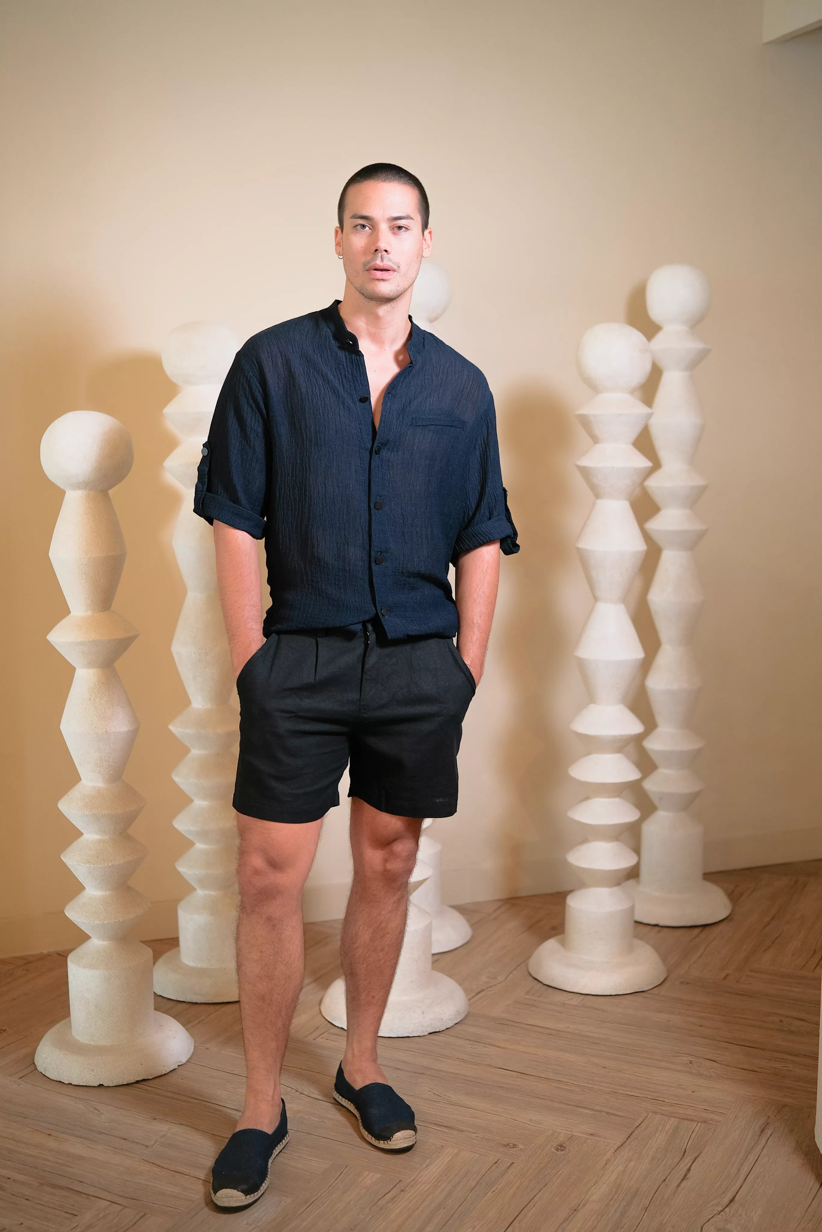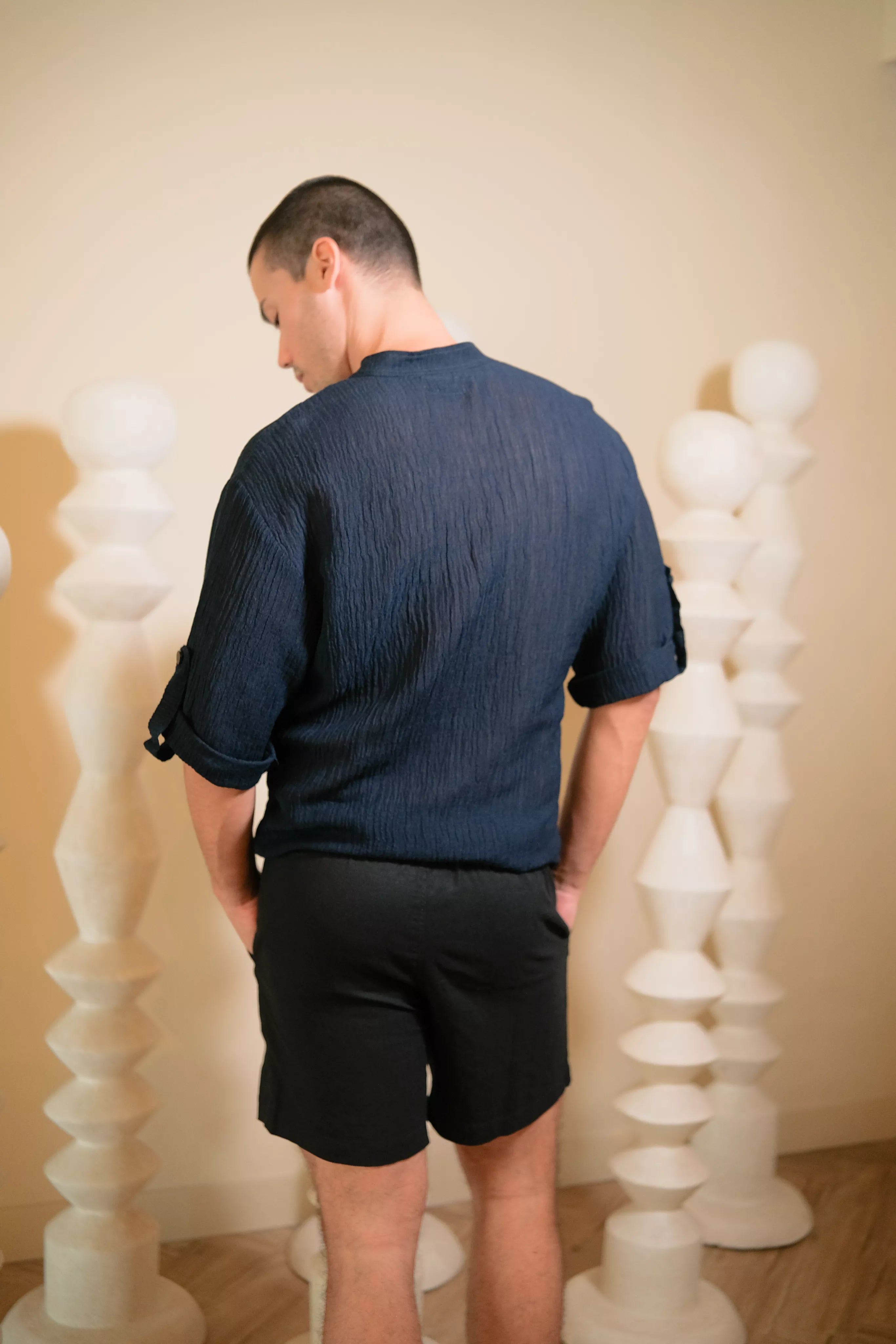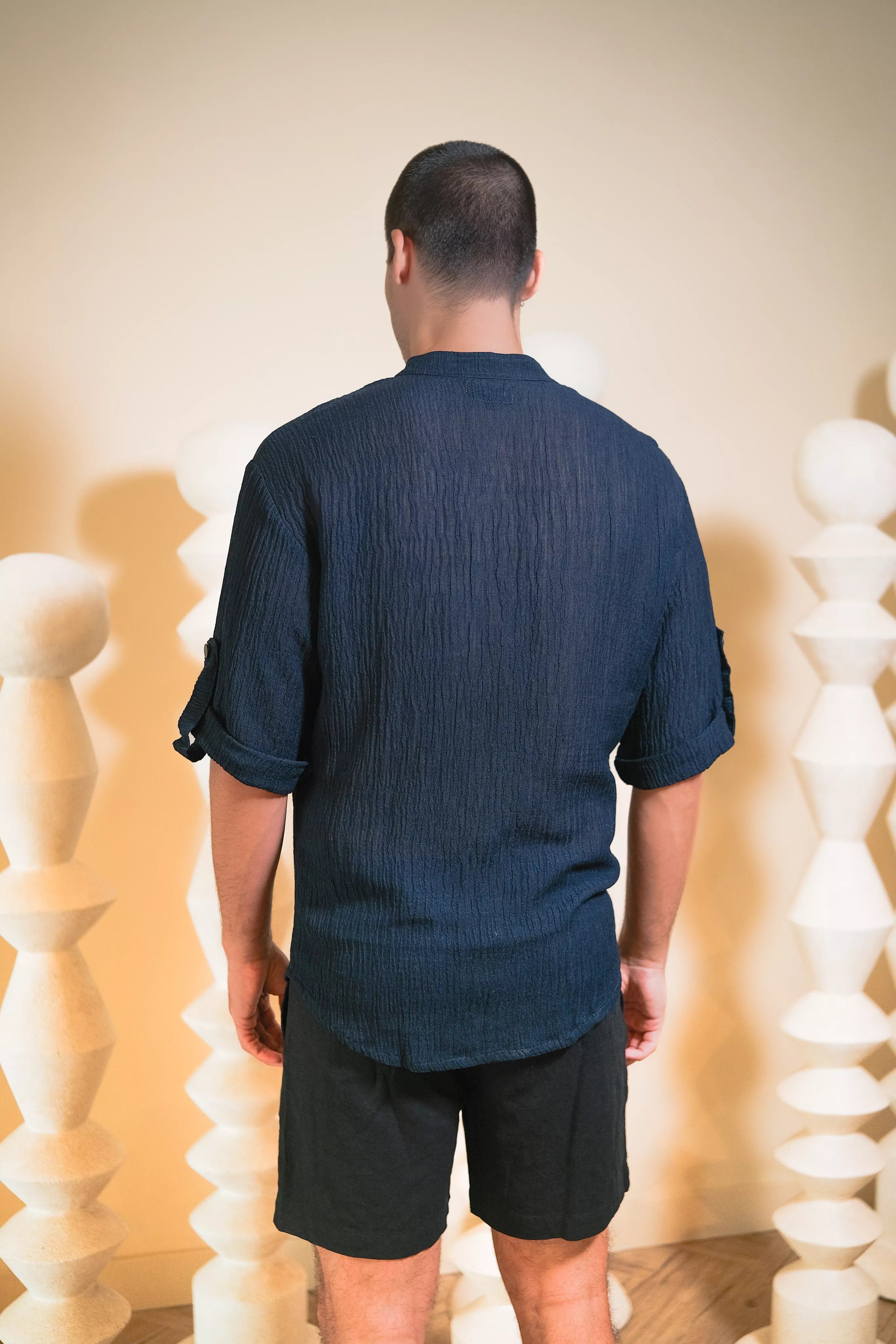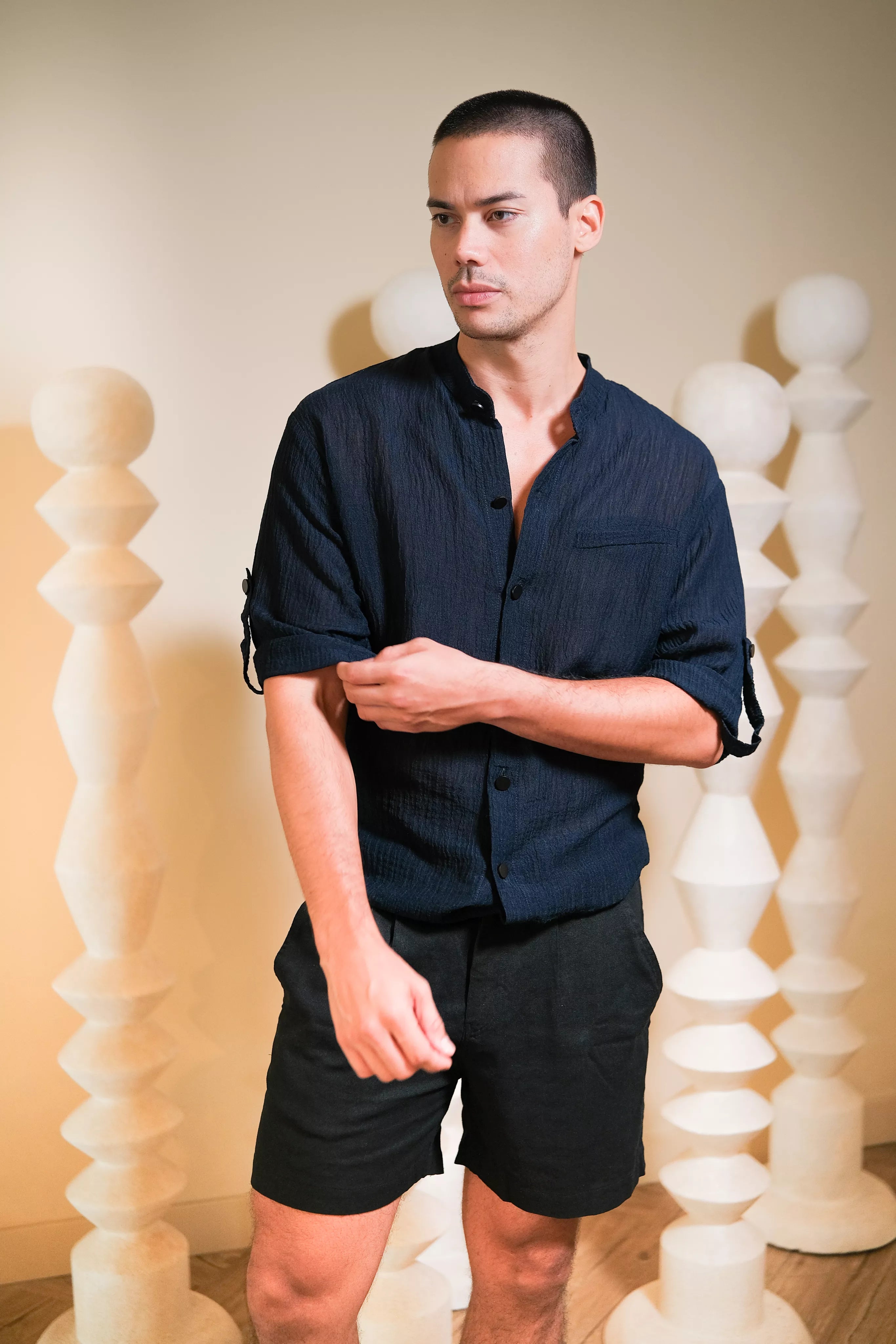 Elevate your style with the APOLLON SHIRT in rich Navy Crinkle, a men's shirt that goes from casual to dressy. This versatile shirt is crafted from lightweight, breathable fabric for all-day comfort. The mandarin collar and folded sleeves add a touch of modern flair, while the flat buttons provide a subtle design detail. The APOLLON SHIRT is a must-have for any man's wardrobe.