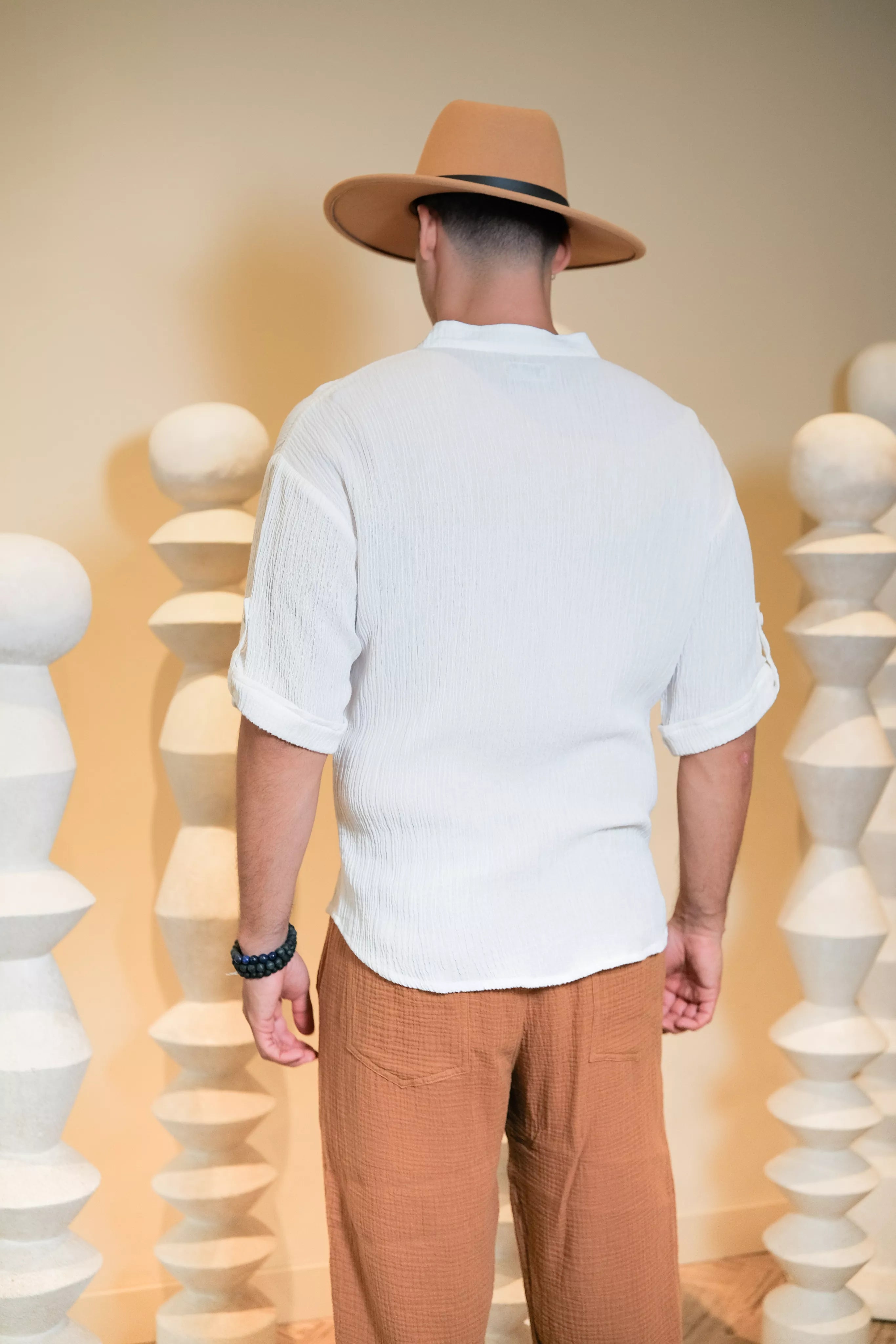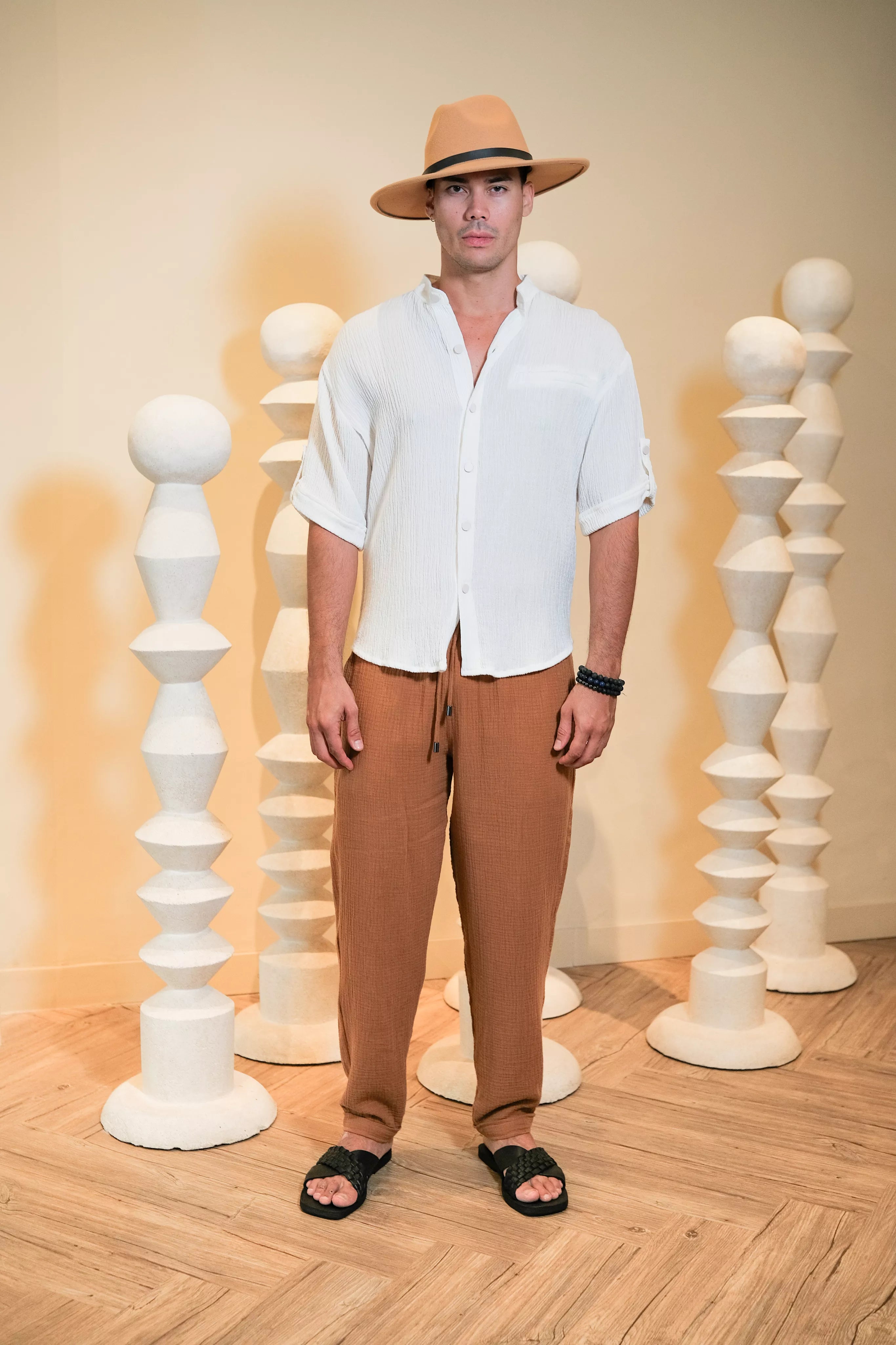 Introducing the GABRIEL PANTS for Men in Brown, where comfort meets sophistication. Made from breathable and comfortable textured cotton fabric, these pants are designed for all-day wear. The rich brown color adds a touch of timeless elegance, making them a versatile addition to any man's wardrobe.
