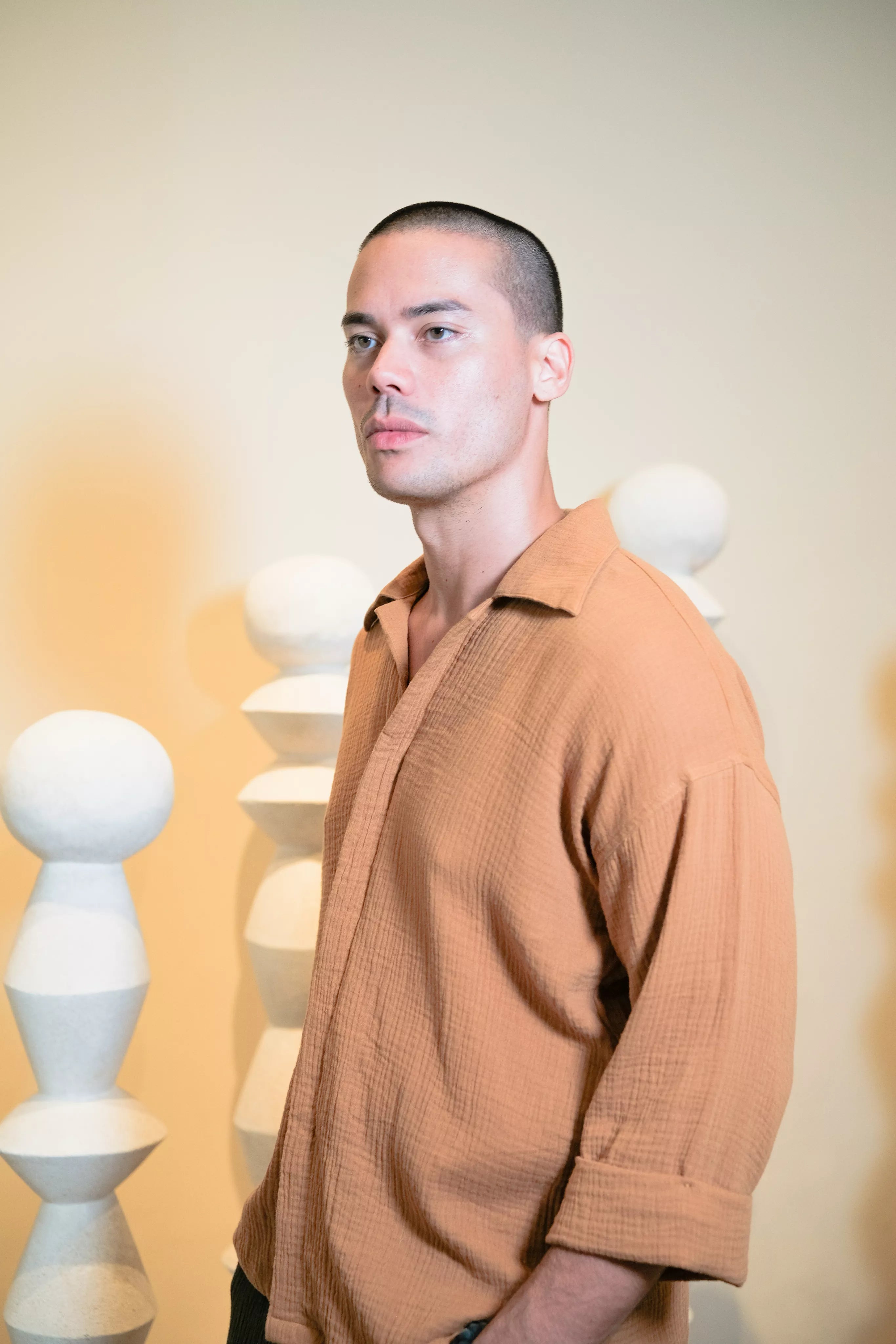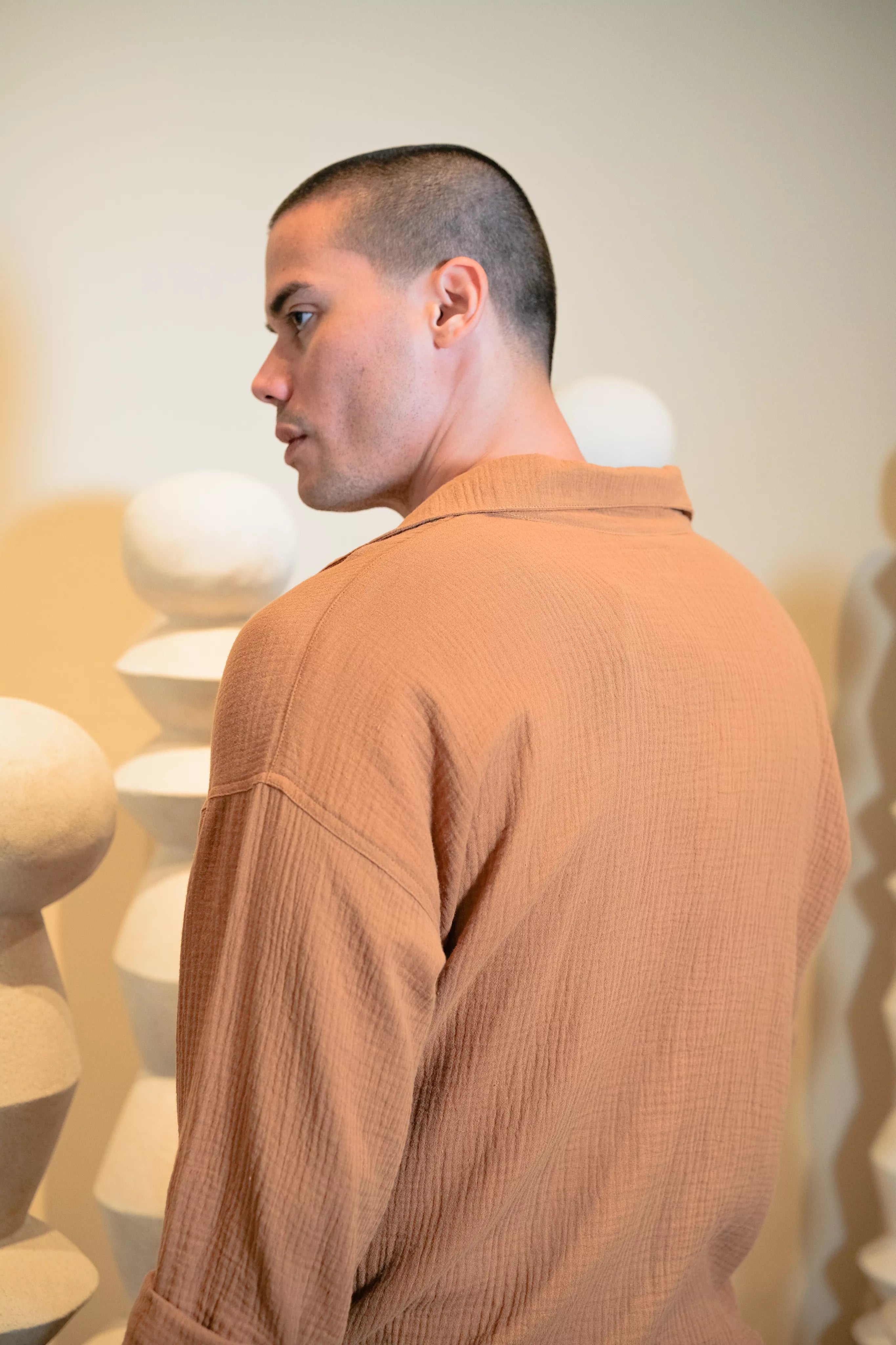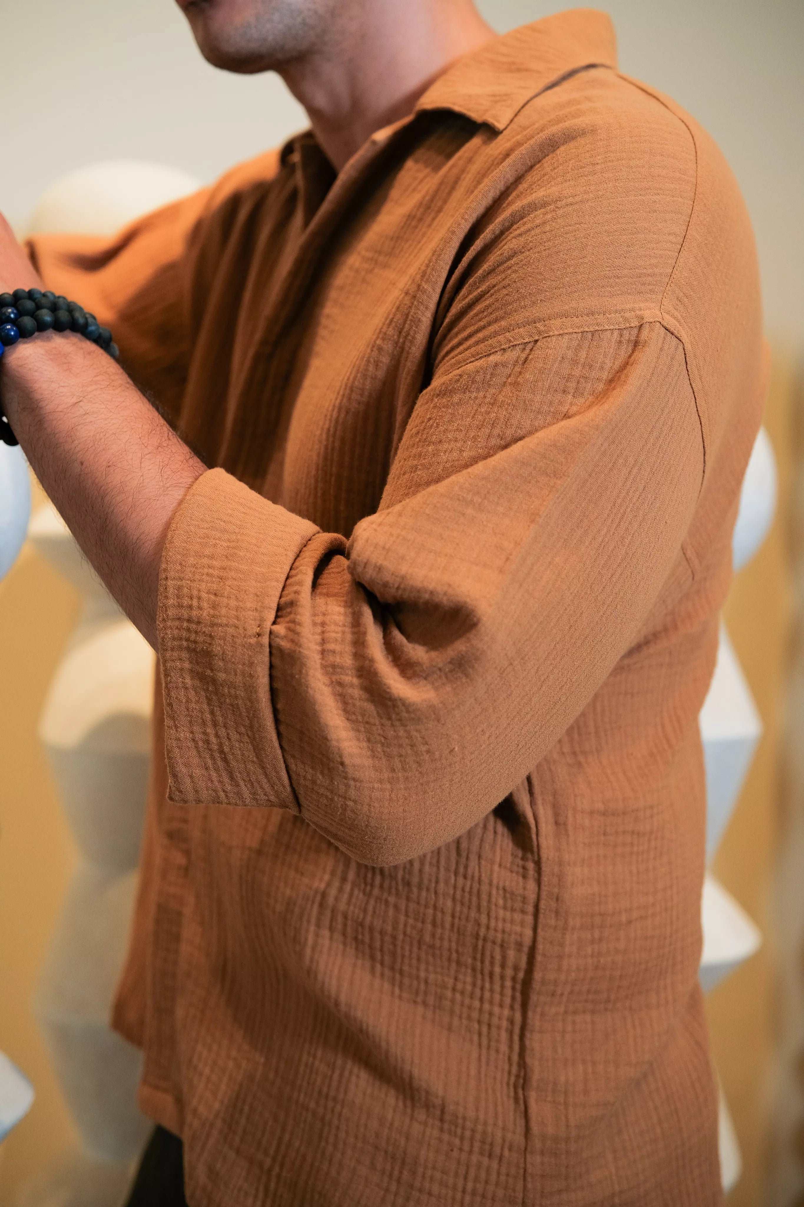 Designed with a relaxed fit, the SHIRT BROWN features drop shoulders and an open collar for a modern, laid-back look. The hidden buttons provide a clean, minimalist aesthetic, while the folded sleeves add a hint of effortless style. Perfect for any occasion, this shirt transitions seamlessly from casual outings to more polished events.