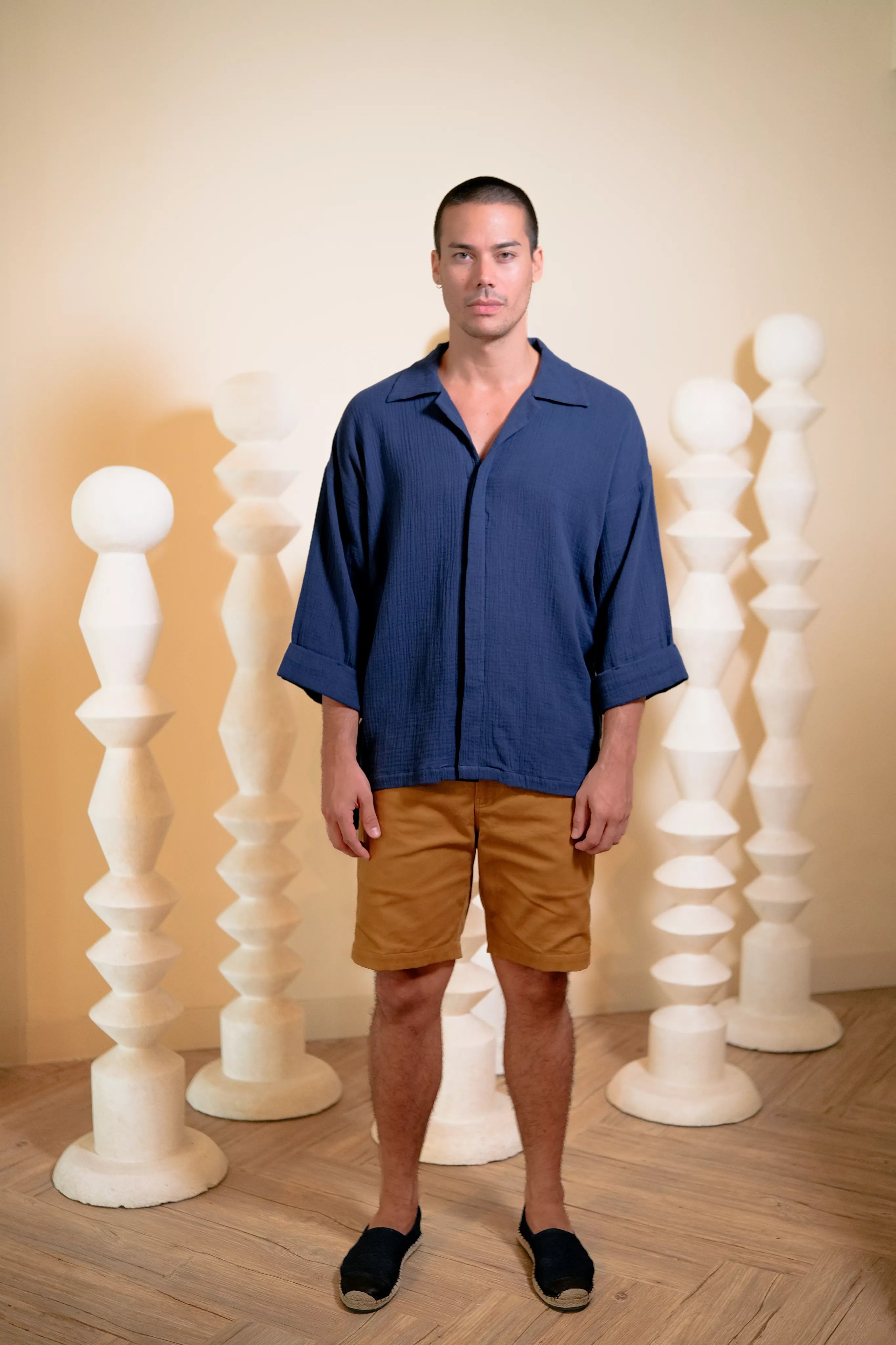 Made with breathable and comfortable textured cotton fabric, this shirt offers all-day comfort with a touch of sophistication. The drop shoulder creates a relaxed silhouette, while the open collar with hidden buttons adds a modern touch. Folded sleeves complete the laid-back look. Perfect for layering or wearing on its own, the GABRIEL SHIRT is a versatile piece for casual occasions.