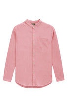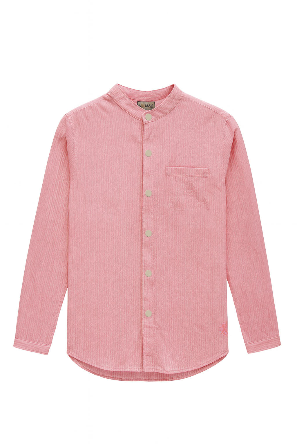 The JAKARTA SHIRT in Dusty Pink Stripe is crafted from breathable, textured cotton for lasting comfort. Designed for smart casual wear and refined lounging, its blue-stripe pattern adds subtle sophistication to any outfit. Featuring full-length sleeves with sleeve and hem bands, a band collar with full button closure, and a chest pocket, this shirt balances functional details with style.