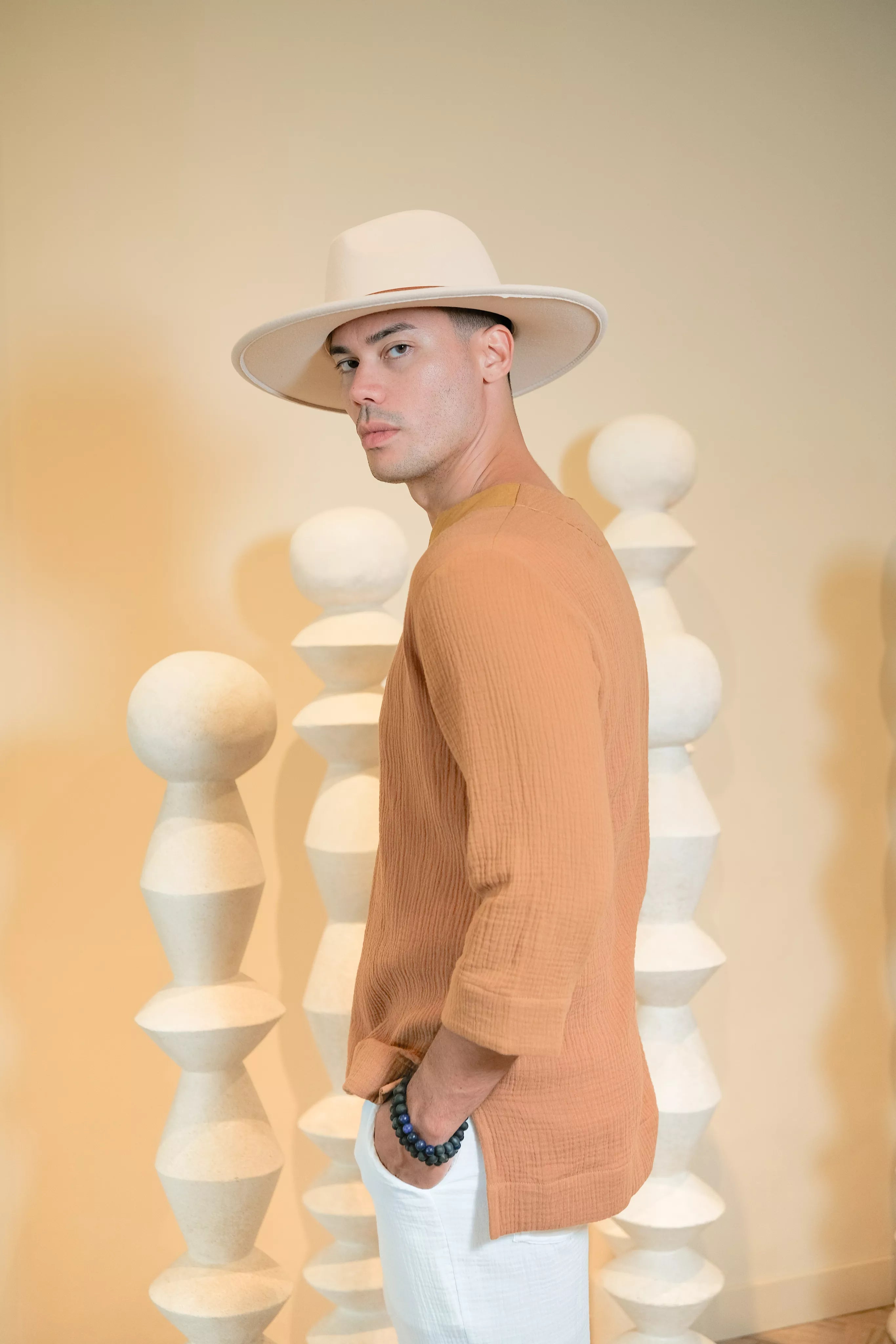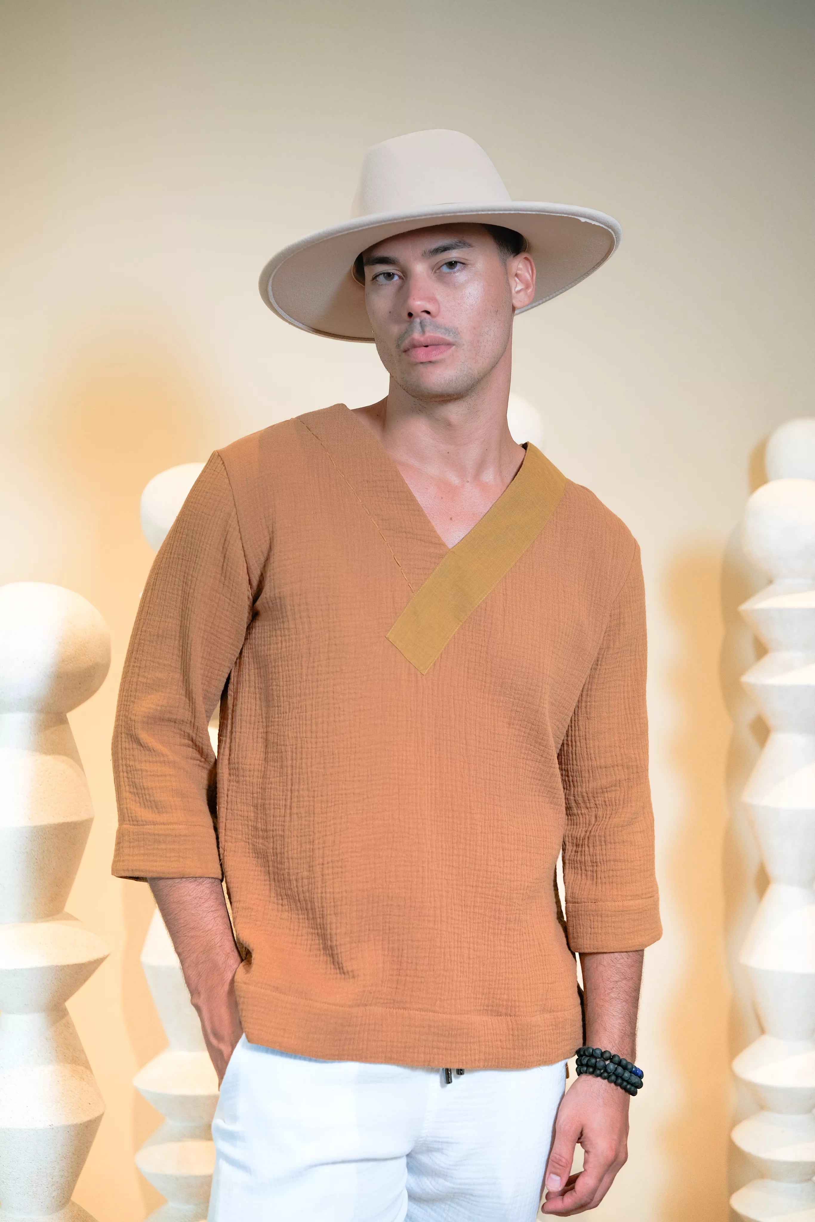 Introducing the JAVIER TOP in Brown, where comfort meets unique craftsmanship. Made from comfortable and breathable textured cotton fabric, this top is designed for all-day wear. The rich brown color adds a touch of warmth and sophistication, making it a versatile addition to any wardrobe.