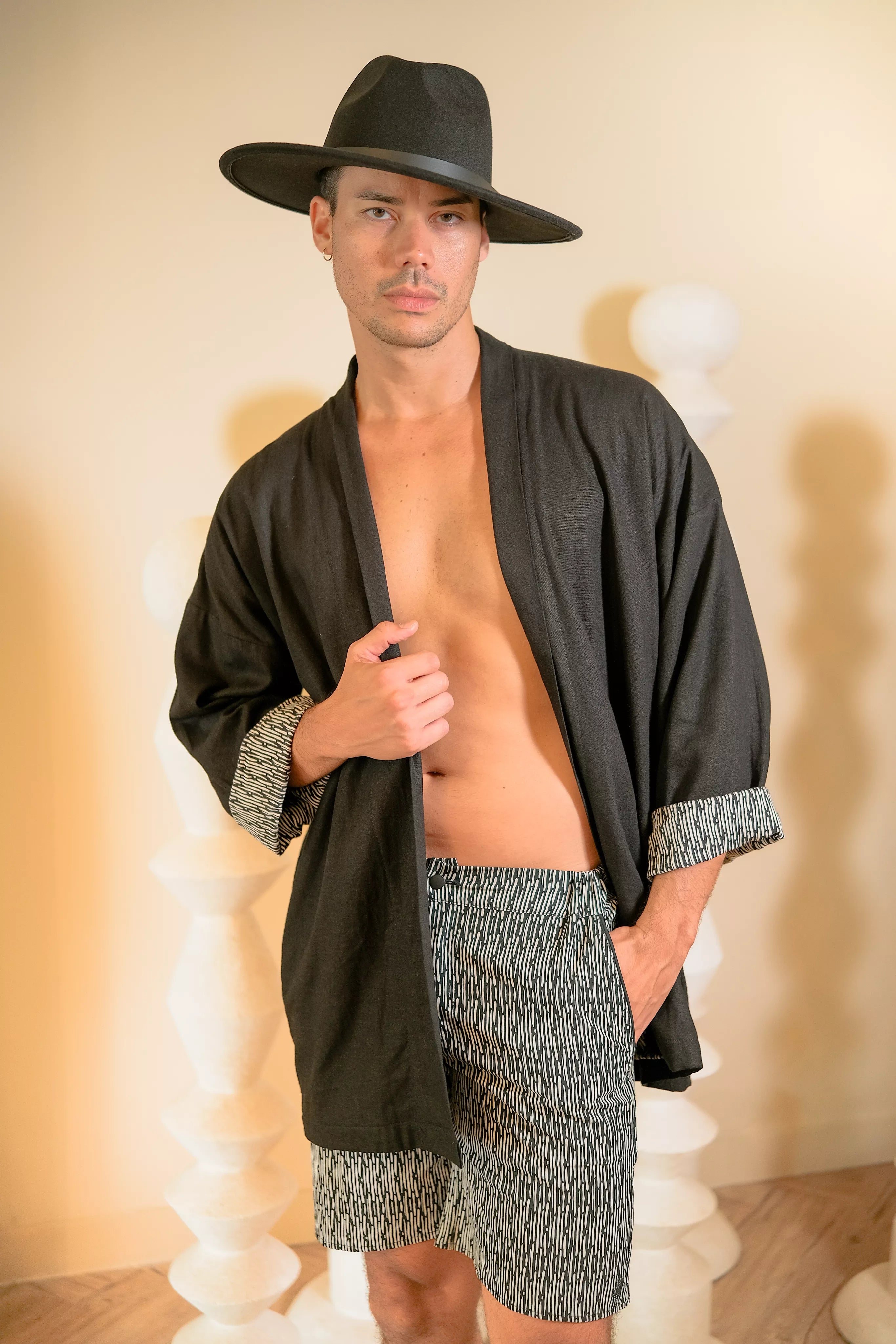 "ROMEO in BLACK is a versatile open kimono made to wear as a chic outerwear for your resort wardrobe. A perfect choice for a summer day because we made it with breathable and comfortable linen material with soft and airy printed lining.