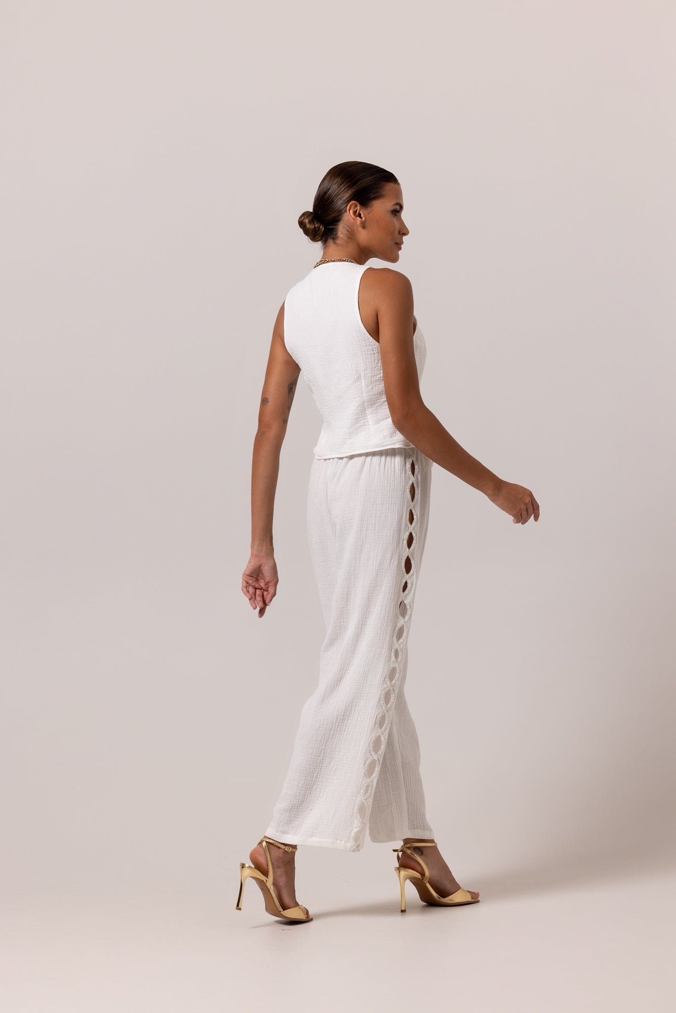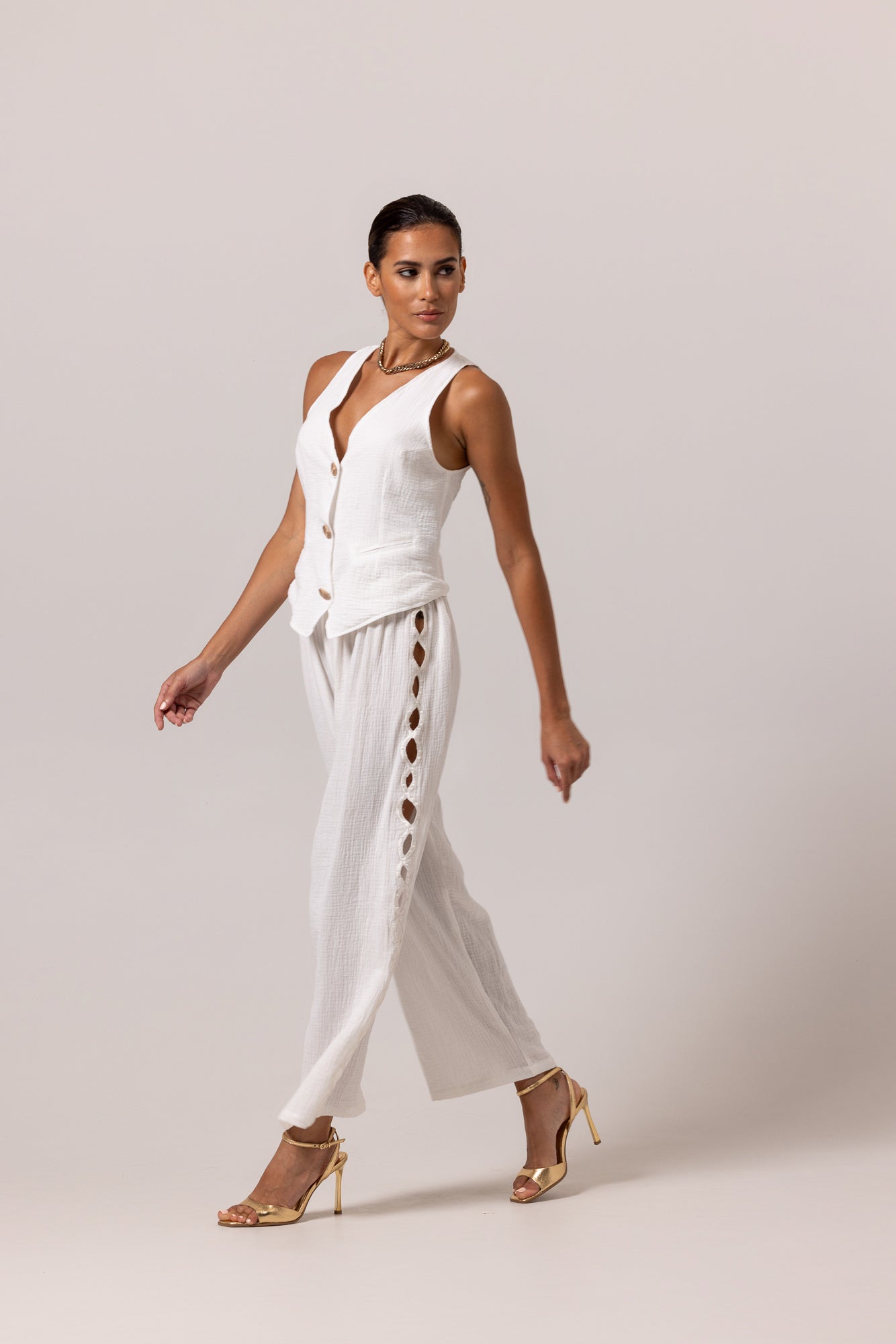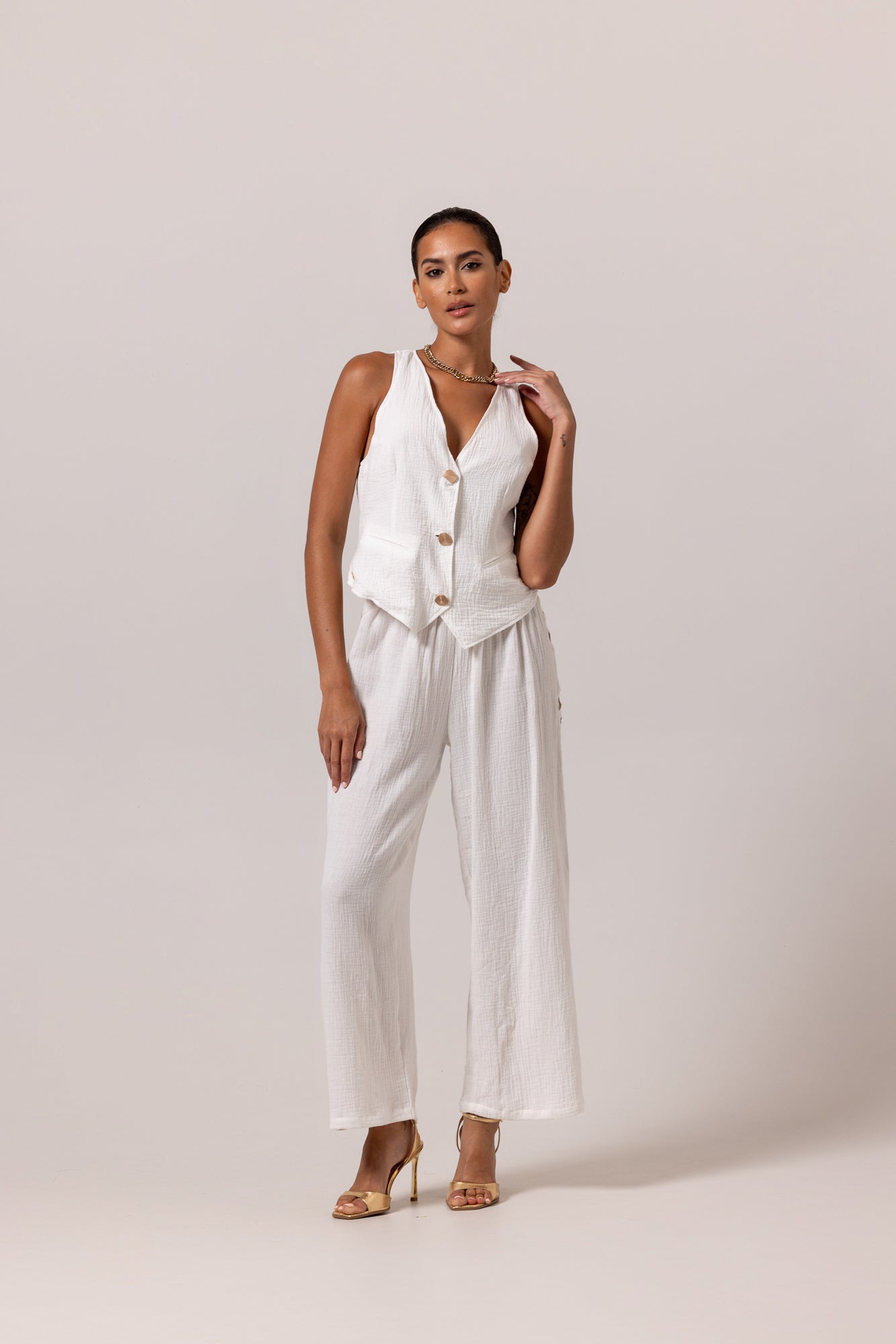 "Comes as a casual vest top with buttons on the front and a clean v-neck cut, this one is designed for you to dance, stroll, lounge, and be in love with. Topped with a pair of front pocket on both sides and a soft crinkle cotton in white color. Perfect for an easy summer day.