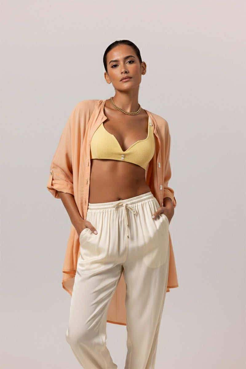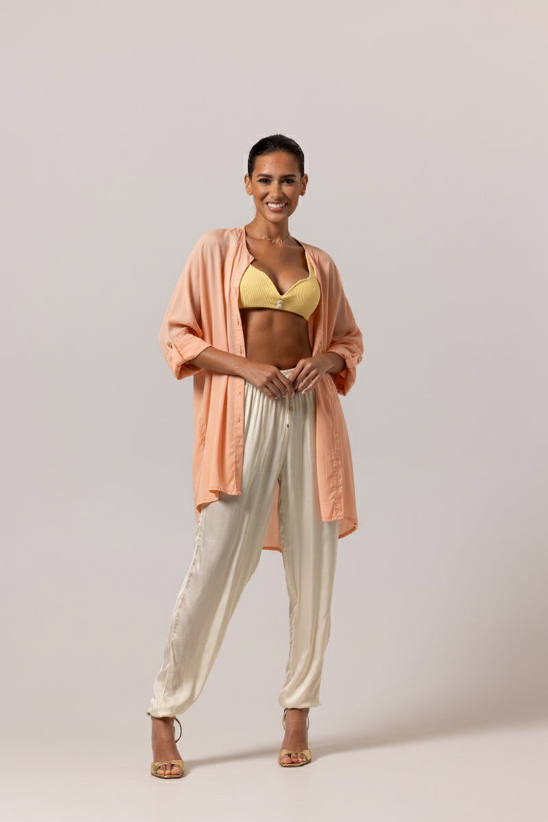 Comes in a pretty peach that compliments any skin color, FLORES oversized shirt made from soft and light fabric. Adorned with shell buttons for an extra spark and a button tab on the sleeve side to adjust the length. Use it as a bikini cover or worn as a top, you'll get instantly chic either way.