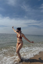 Inspired by retro styles, URSULA 2P two-toned bikini in neutral caramel-and-white will complement any body type. With high-rise panties and a classical halter silhouette. Accented with a white belt at the waist to bring some contrast and alluring detail.