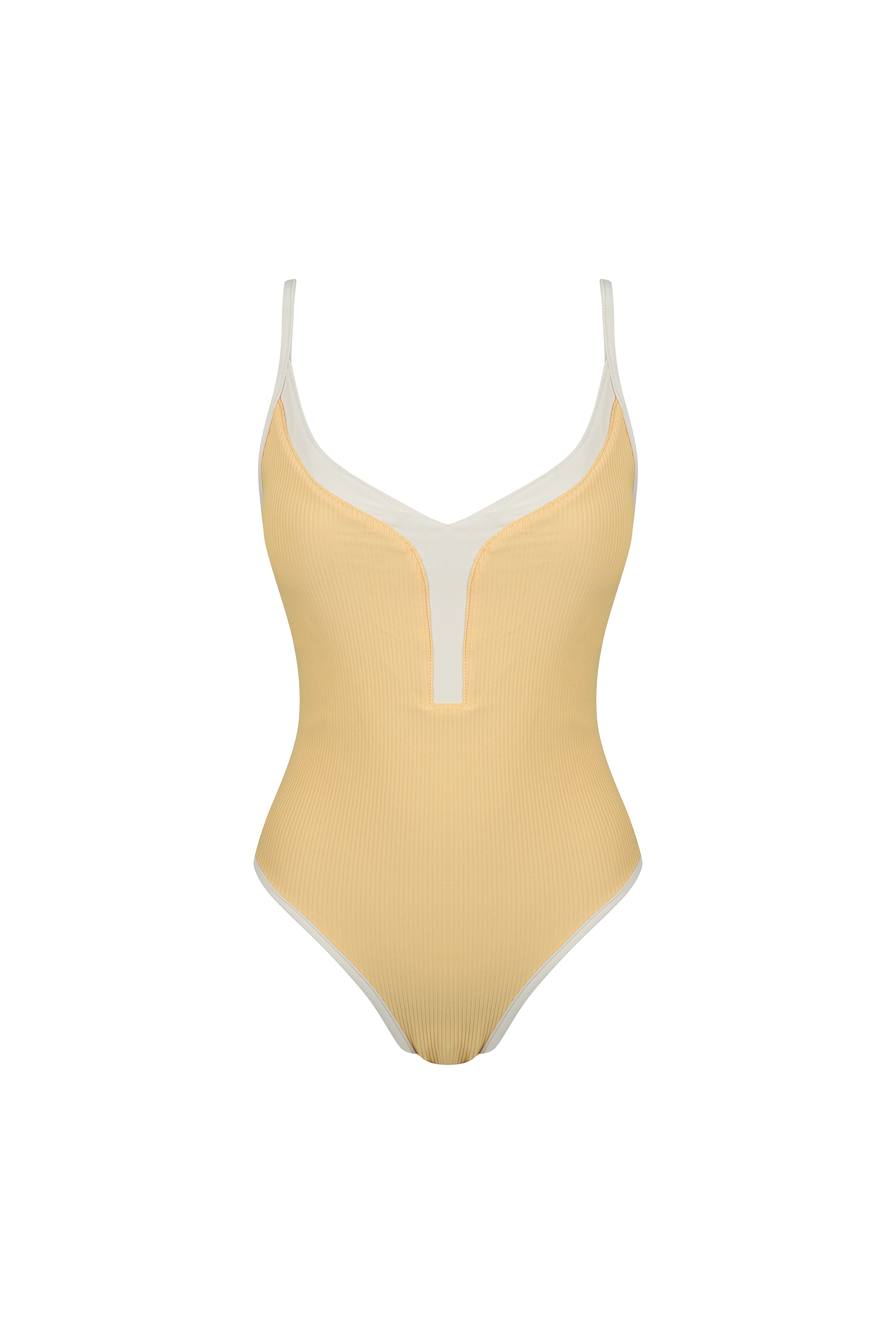 Chanelling your inner Audrey Hepburn with fabulous VERA one-piece. High-leg cut and adjustable thin straps to flatter your curves. Comes in a vibrant lemon hue with ivory hems, this piece offers moderate coverage while celebrating your feminine shape with effortless elegance.