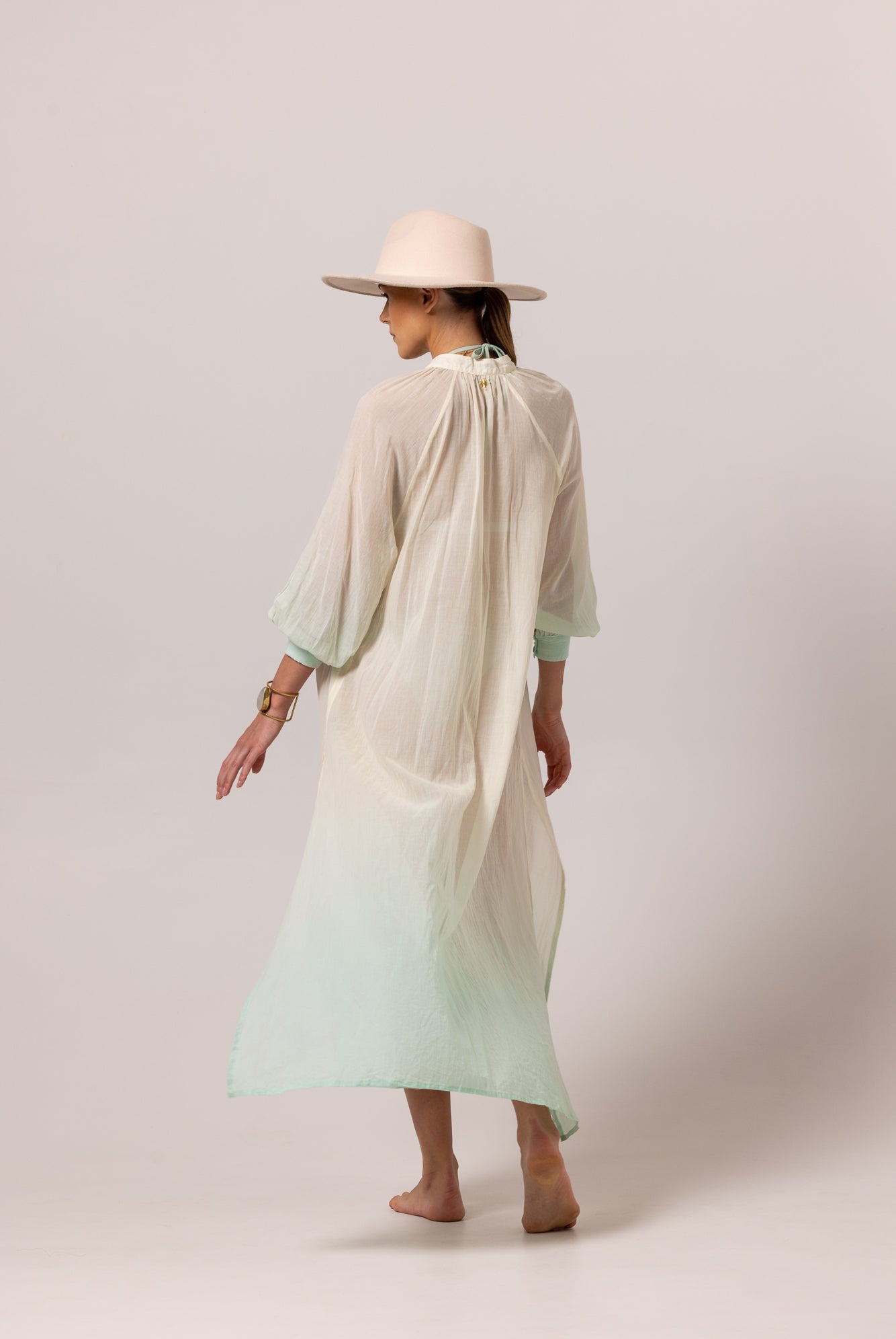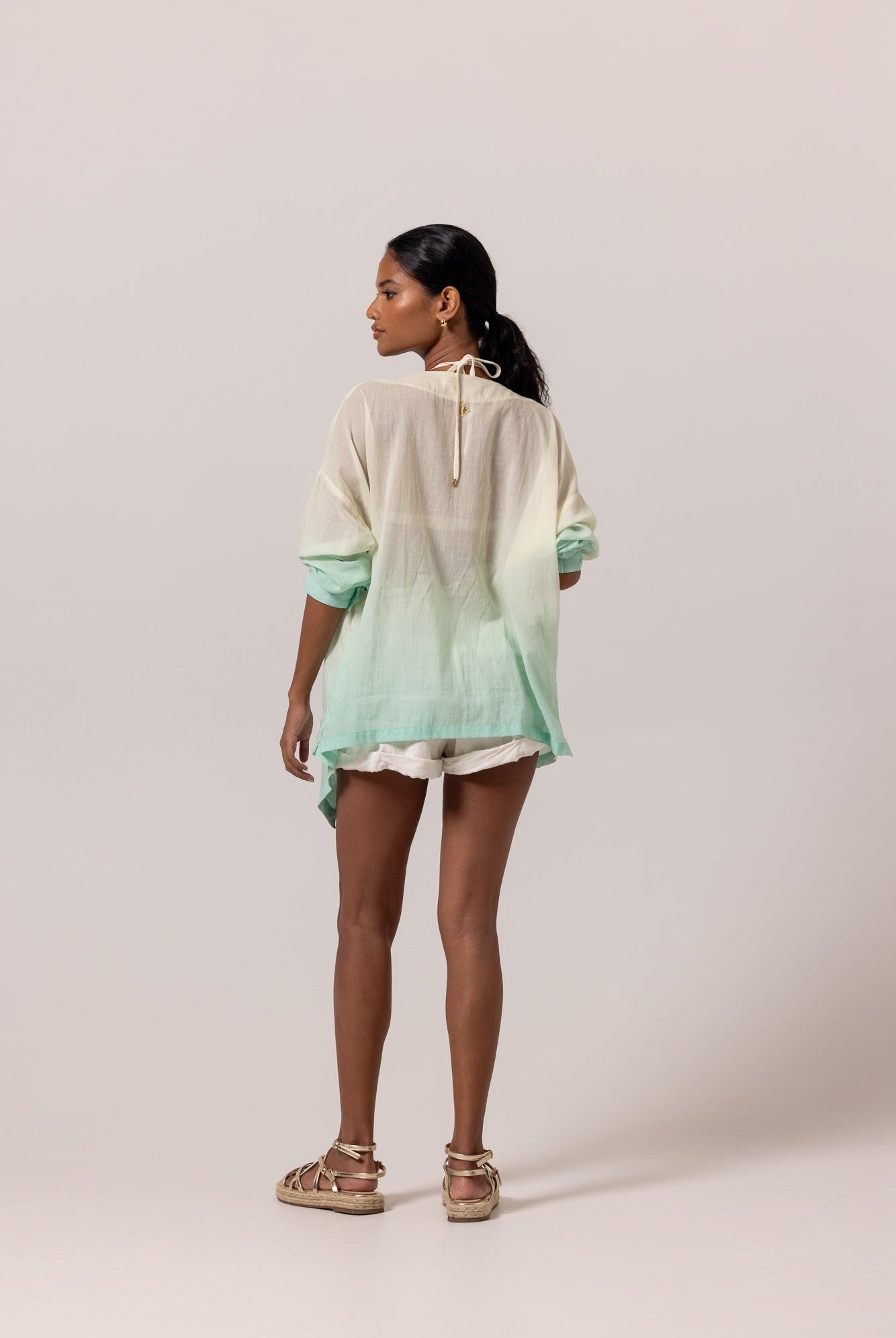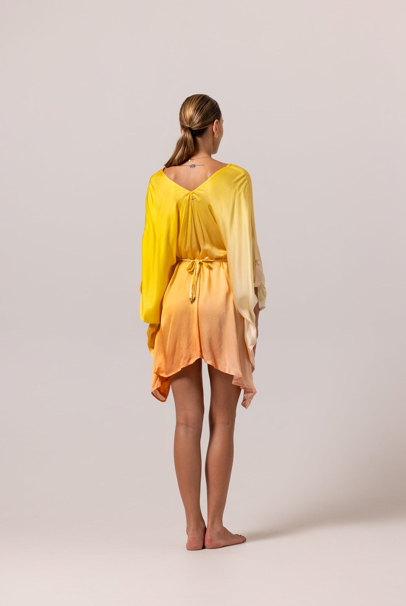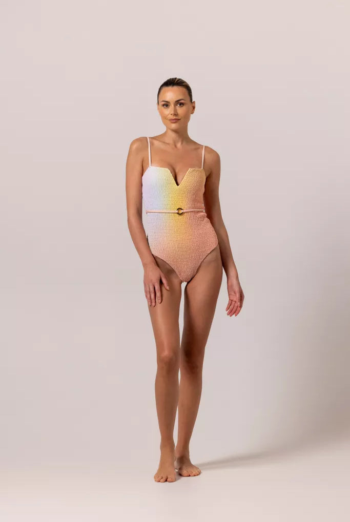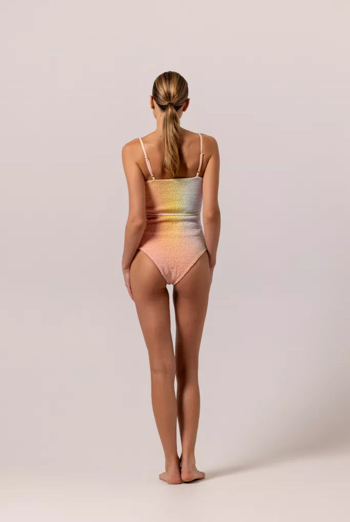 Our exclusive «dégradé color palette» flows like the day itself – delicate morning blues, sunlit aquas, warm corals, and deep golden ambers – capturing the magic of each moment under the sun. This luminous gradient breathes life into luxurious fabrics, flattering silhouettes, and signature details designed for women who embody elegance, freedom, and inner fire.