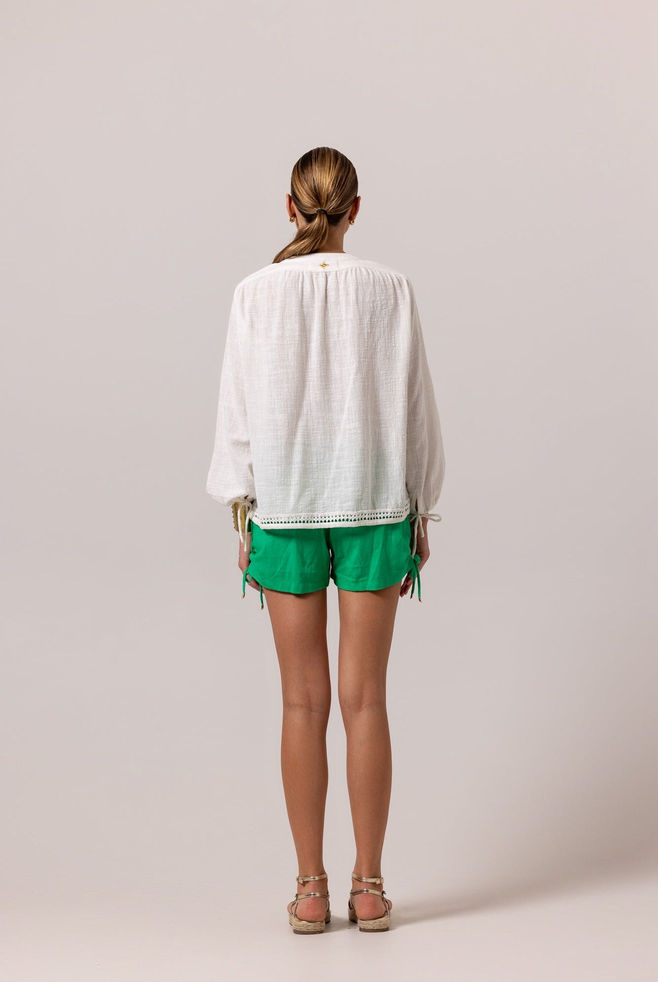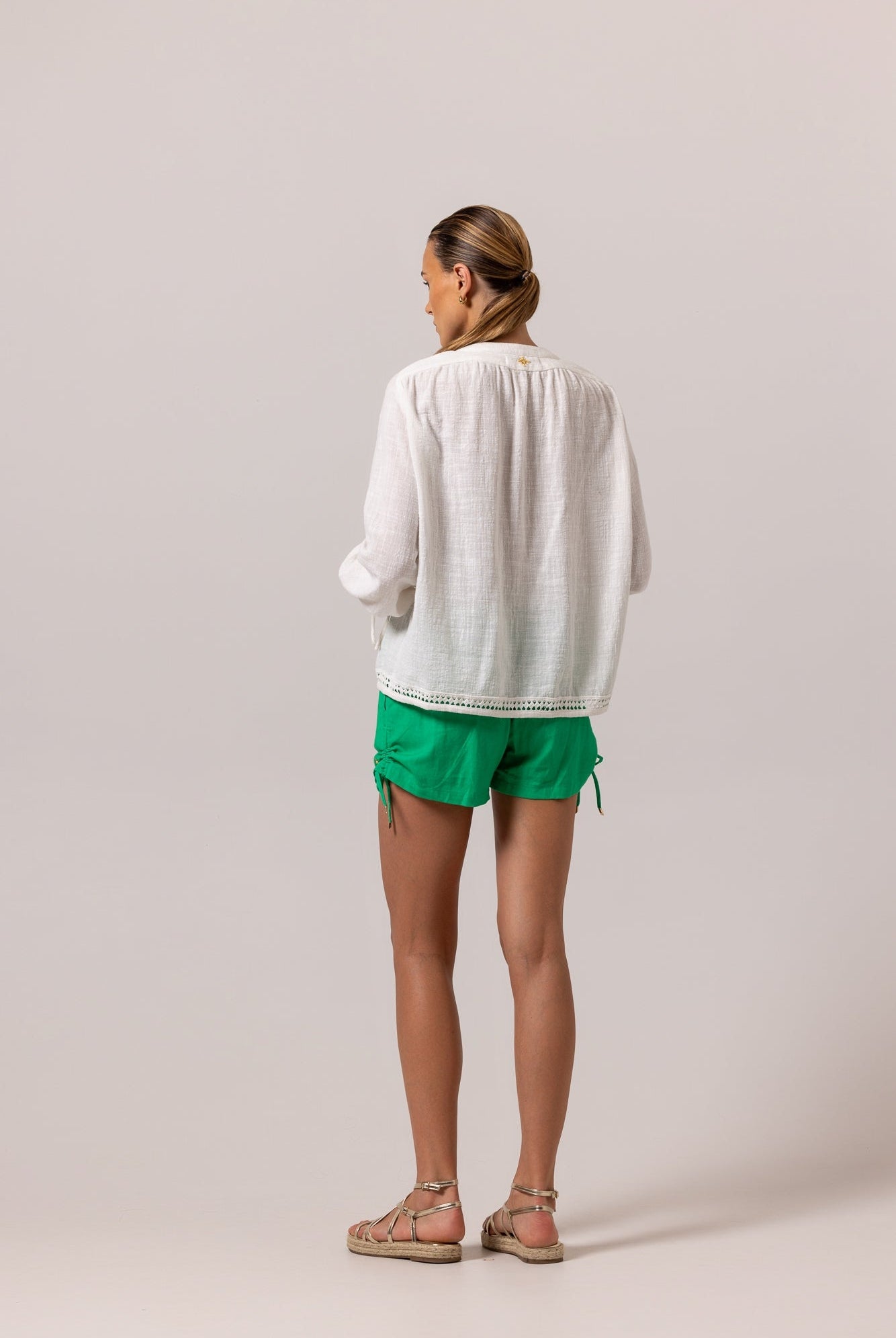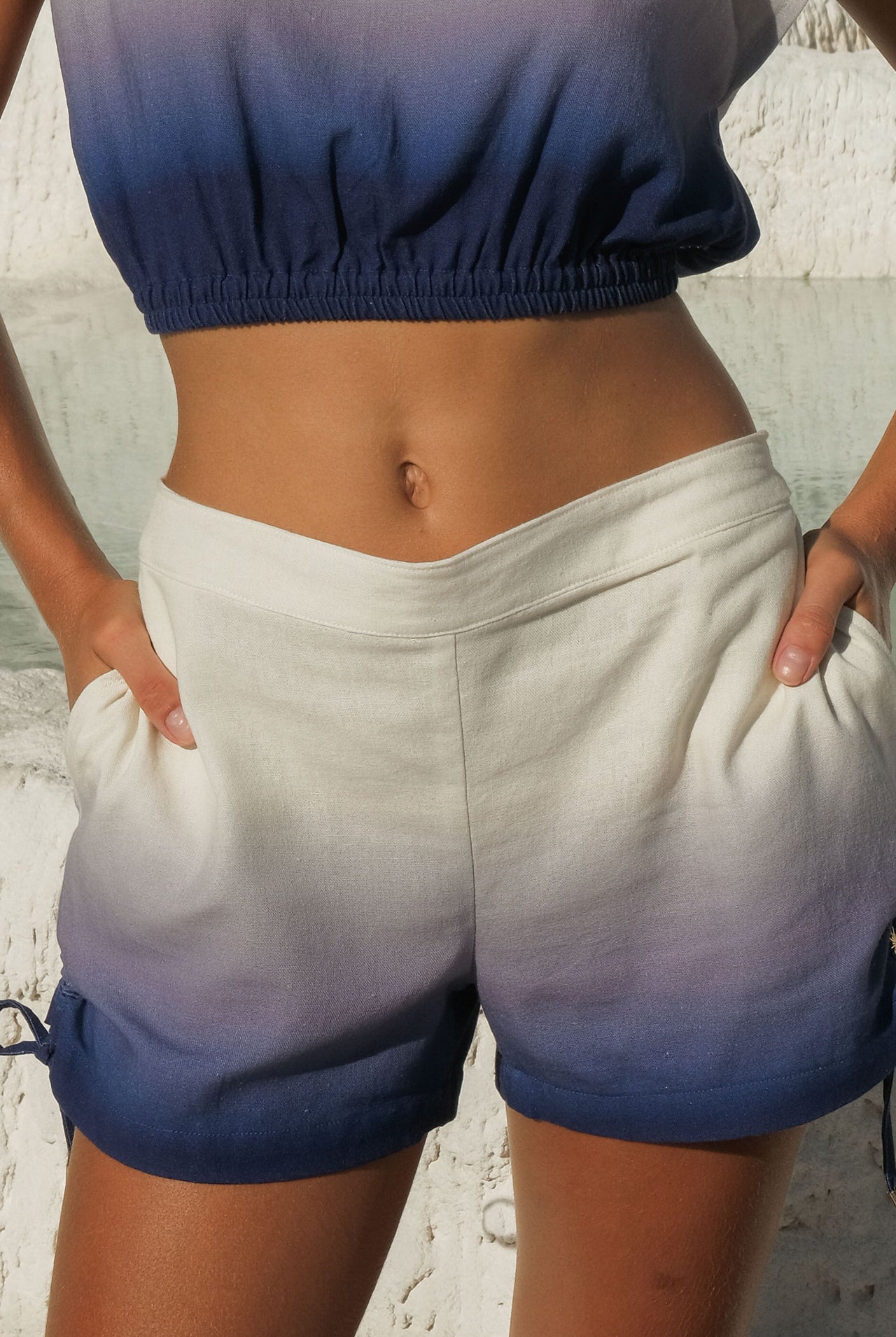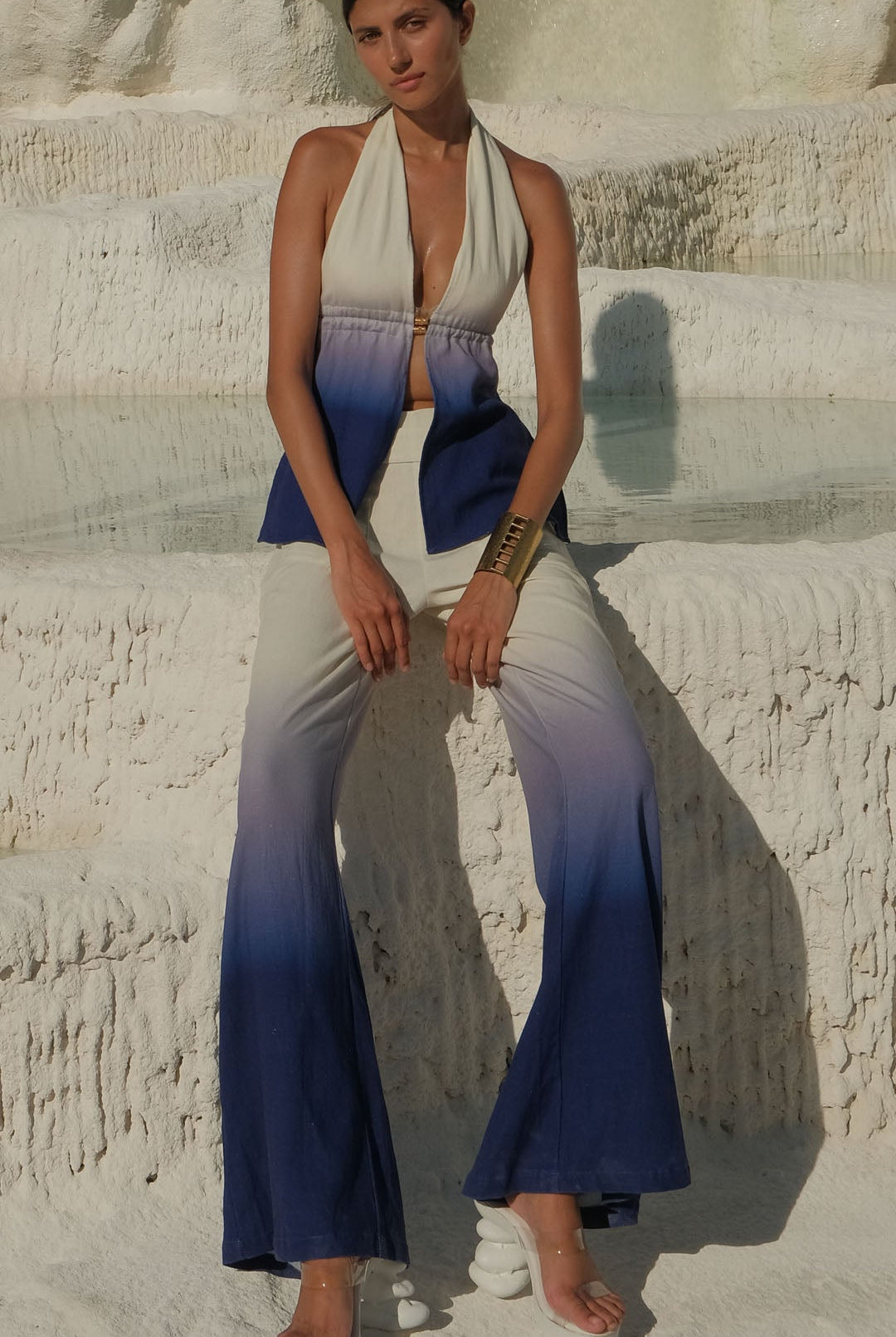 Our exclusive «dégradé color palette» flows like the day itself – delicate morning blues, sunlit aquas, warm corals, and deep golden ambers – capturing the magic of each moment under the sun. This luminous gradient breathes life into luxurious fabrics, flattering silhouettes, and signature details designed for women who embody elegance, freedom, and inner fire.
