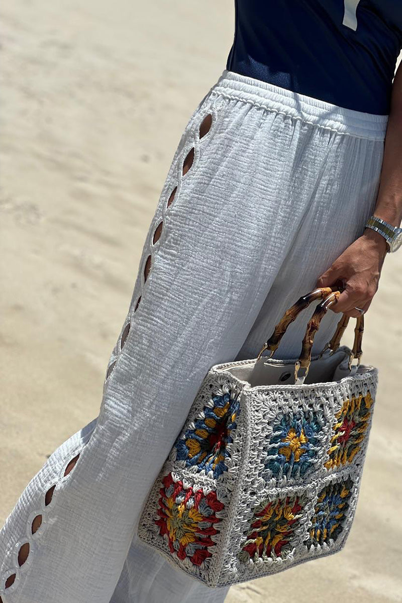 Give some touch of a fun-and-flirty look with CANTIK pants. Comes in a white color depicting clouds on the clear summer sky, it comes with a train of cutout details on the side and a subtle embroidery to make a unique touch. Elastic waist and relaxed fit.