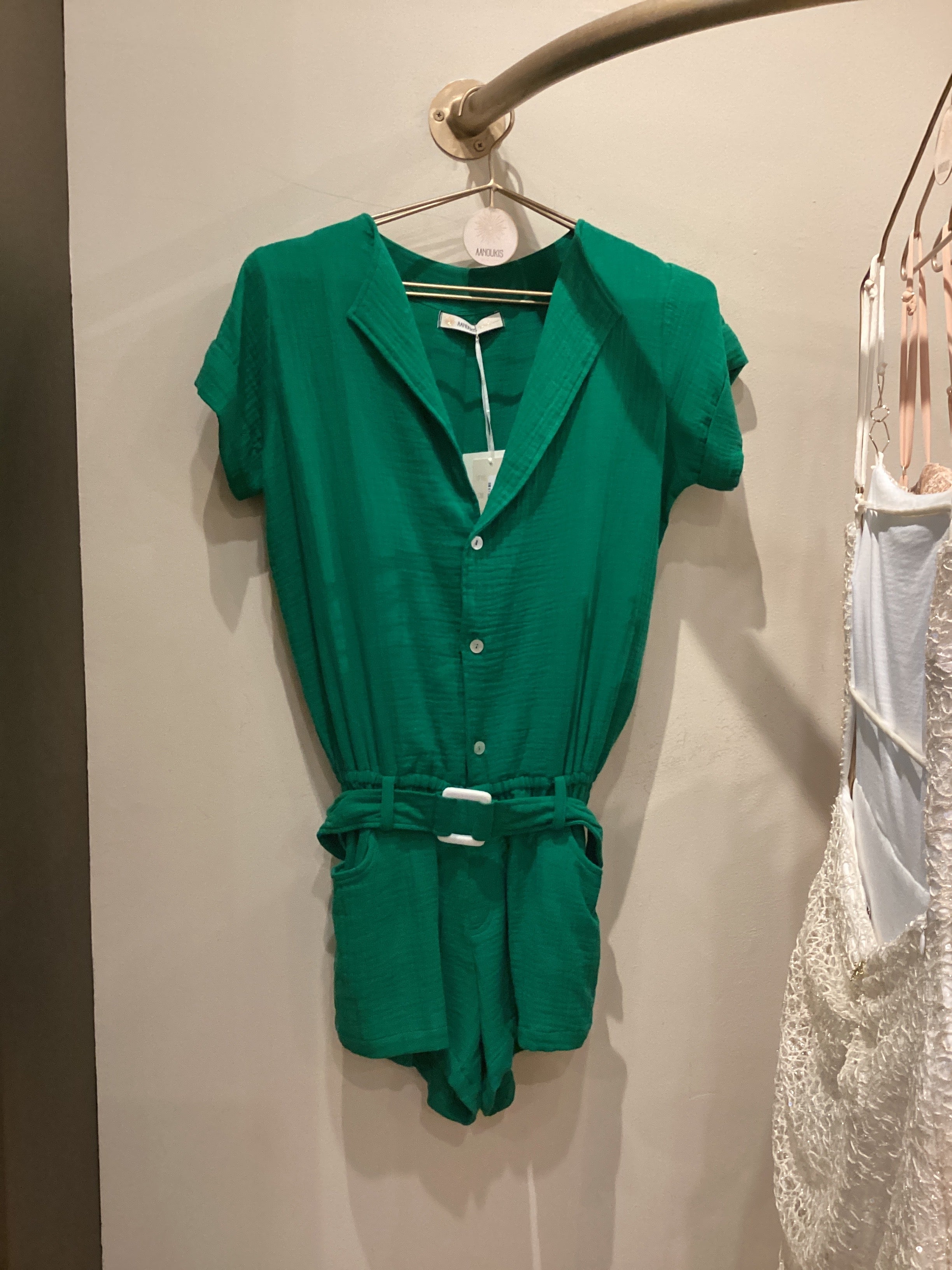 Look simply stunning in this cool and comfy SANTA MONICA Jumpsuit. Featuring a vintage belt, short sleeves, and a comfortable 100% Cotton Gauze in green hue, it's the perfect one-and-done look for when the temps are high and you're looking for an easy, breezy way to stay stylish! It's the perfect choice for those balmy summer days.