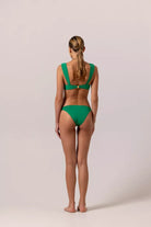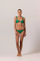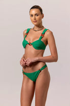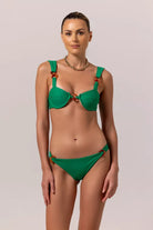 Gorgeously step into your summer days with FEEL PRETTY 2P bikini set in lavish green color. The underwire structure for the top will support your feminine curves. Accessorized by tortoise-patterned rings for both the top and panties to give you a hint of contemporary touches.