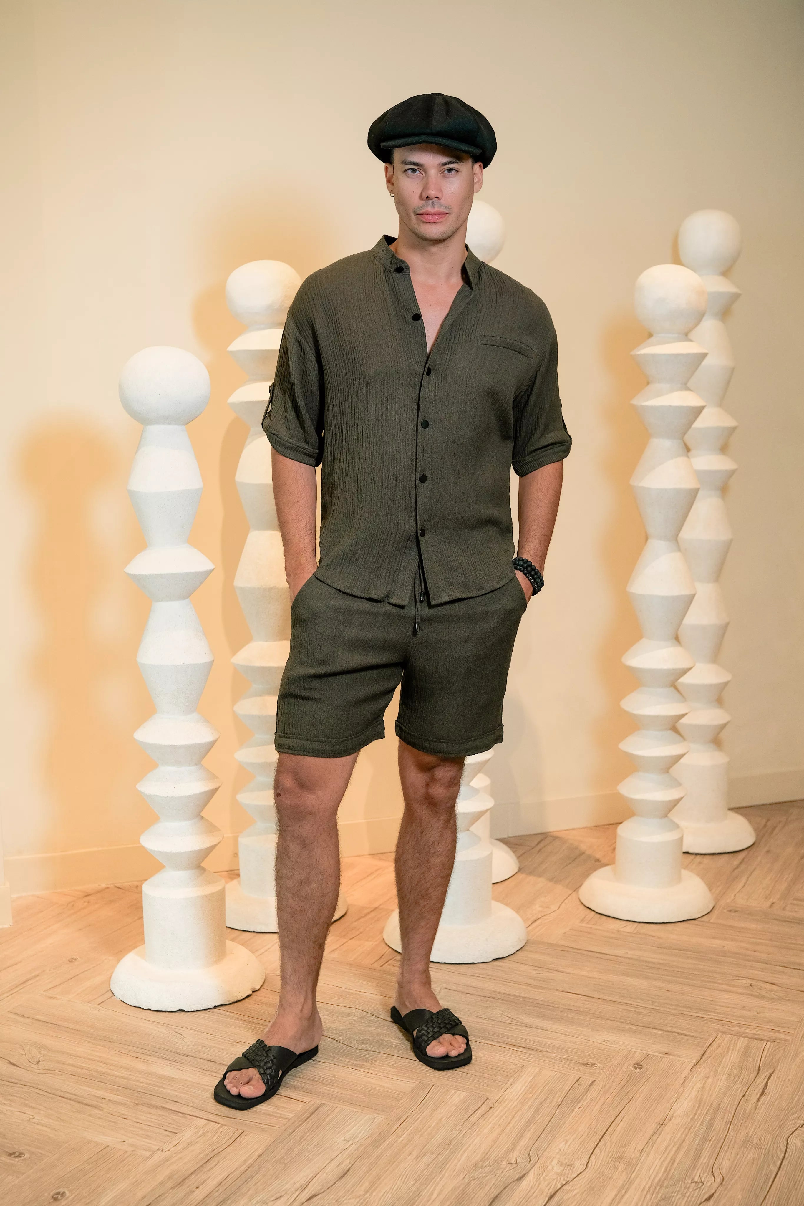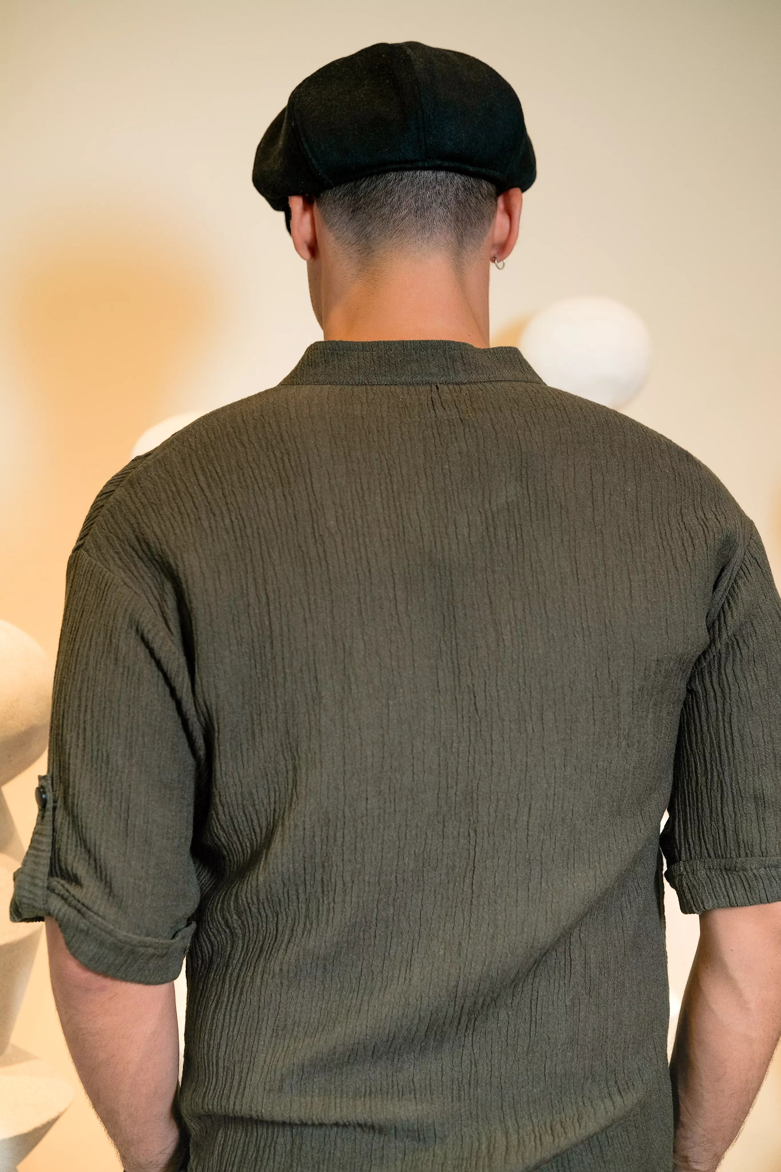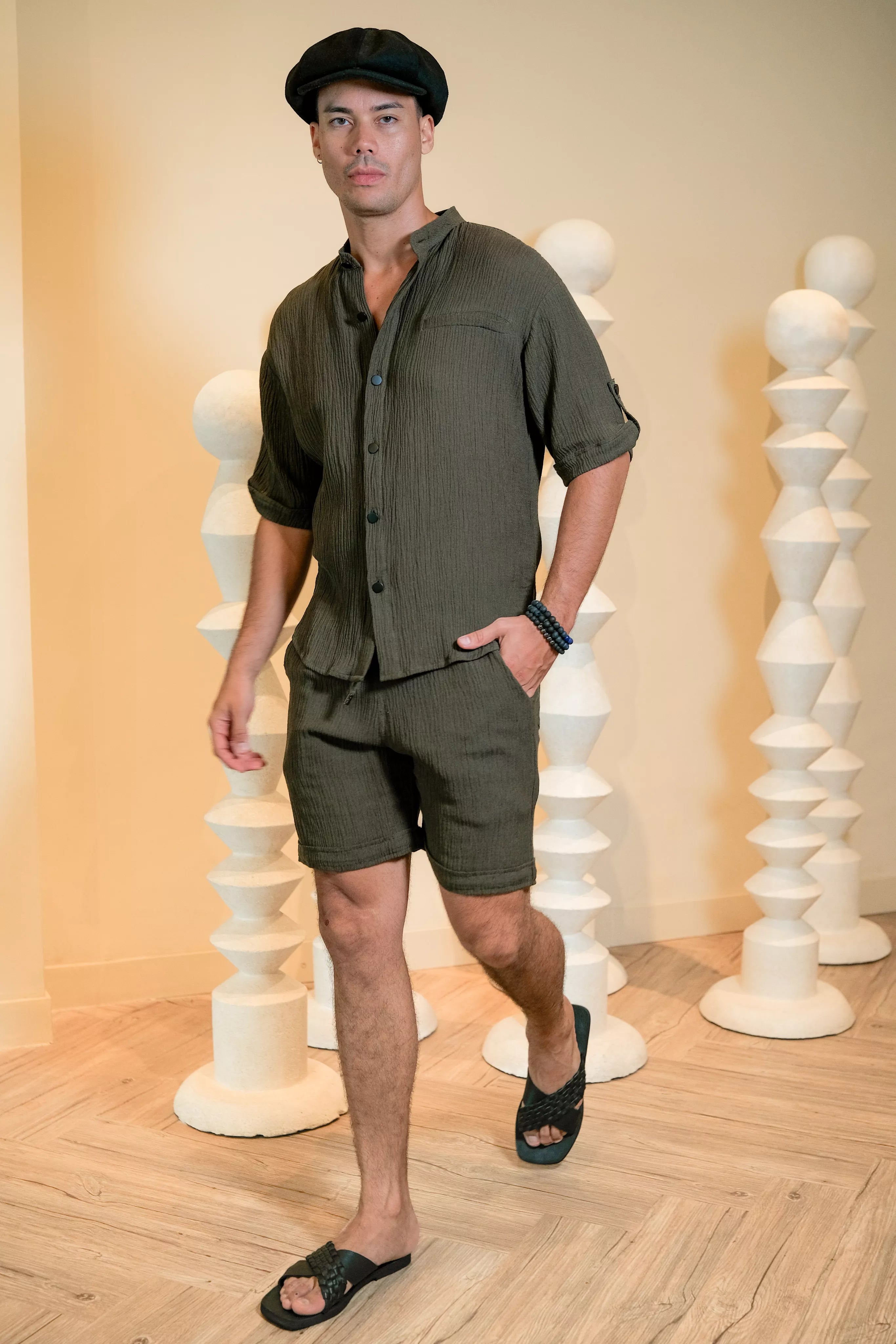 Elevate your style with the APOLLON SHIRT in Khaki, a men's shirt that goes from casual to dressy. This versatile shirt is crafted from lightweight, breathable fabric for all-day comfort. The mandarin collar and folded sleeves add a touch of modern flair, while the flat buttons provide a subtle design detail. The APOLLON SHIRT is a must-have for any man's wardrobe.