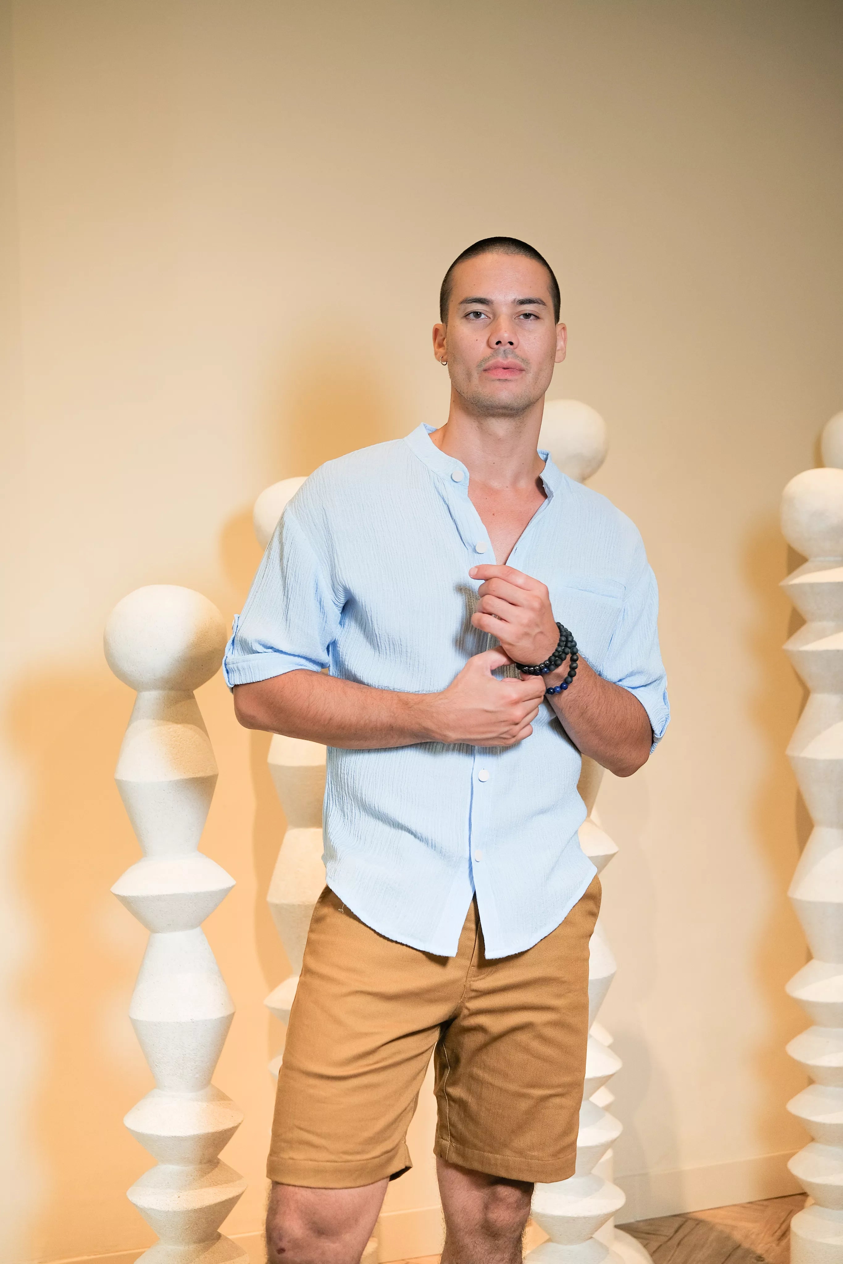 Elevate your style with the APOLLON SHIRT in Soft Blue, a men's shirt that goes from casual to dressy. This versatile shirt is crafted from lightweight, breathable fabric for all-day comfort. The mandarin collar and folded sleeves add a touch of modern flair, while the flat buttons provide a subtle design detail. The APOLLON SHIRT is a must-have for any man's wardrobe.